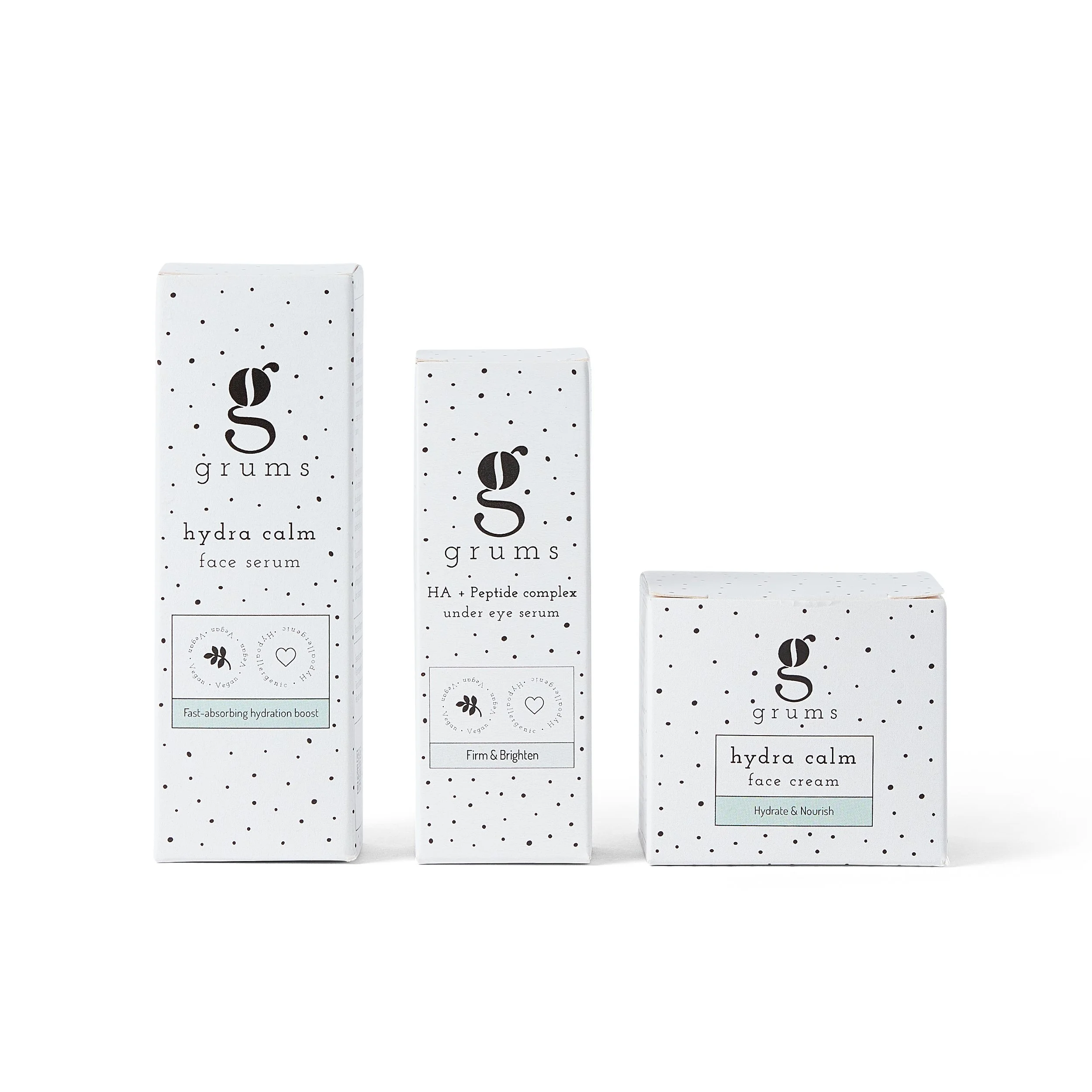 Purchase the grums Hydra Calm Face Cream and Facial Serum set, and receive the HA + Peptide Complex Under Eye Serum as our gift (normally £30). A thoughtful trio to hydrate, smooth, and brighten, your daily glow, refined